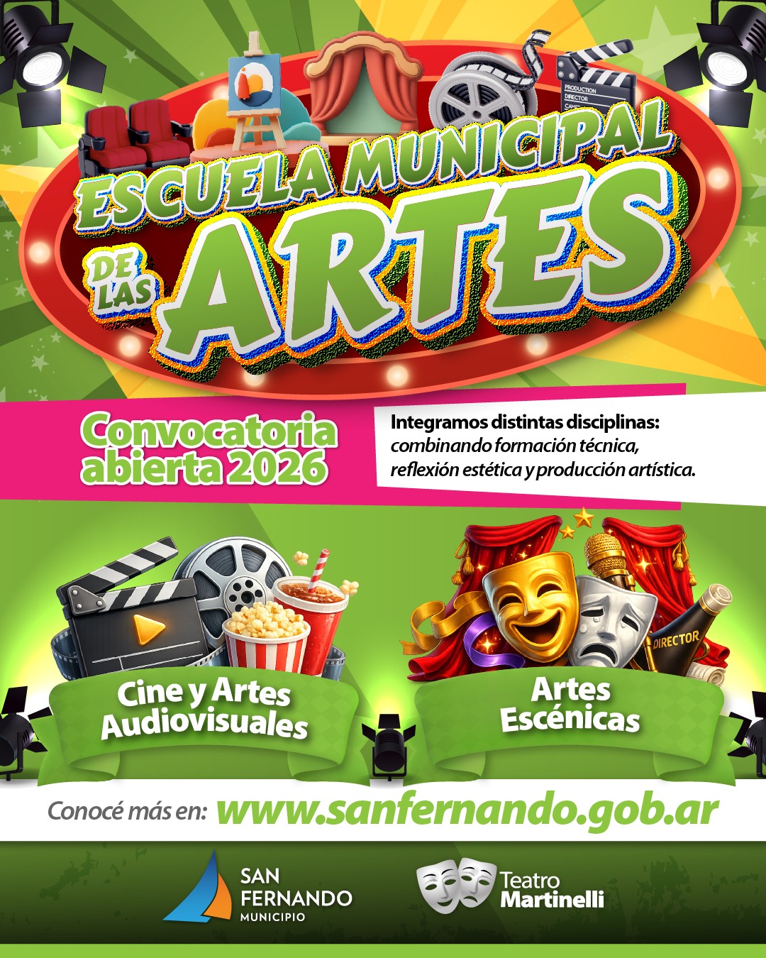 La Secretaría de Cultura y Turismo del Municipio de San Fernando fortalece su programa de formación artística en el histórico Teatro Martinelli con la nueva "Escuela Municipal de las Artes", que articula distintos lenguajes y disciplinas para promover la formación técnica, la reflexión estética y la producción artística.